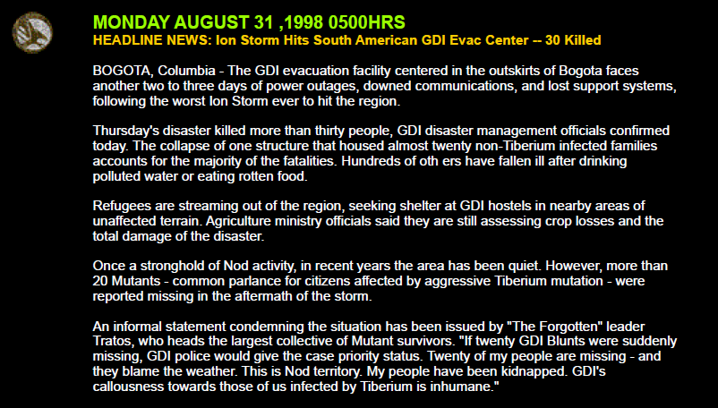 Примечание - Это мой неофициальный перевод вымышленных новостей, связанный с Command & Conquer: Tiberian Sun. Ссылка на оригинальный архив. ГЛАВНЫЕ НОВОСТИ: Ионный Шторм Обрушился на Южноамериканский Эвакуационный Центр GDI - 30 человек погибло БОГОТА, Колумбия - Эвакуационный центр GDI, расположенный на окраине Боготы, столкнется с перебоями в подаче электроэнергии, отключением связи и потерей систем поддержки еще на два-три дня после сильнейшего Ионного Шторма, когда-либо обрушившегося на регион. В результате стихийного бедствия в четверг погибло более тридцати человек, подтвердили сегодня представители Управления по борьбе со стихийными бедствиями GDI. Обрушение одного здания, в котором проживало почти двадцать не инфицированных тибериумом семей, является причиной большинства смертельных случаев. Сотни других людей заболели после того, как выпили загрязненную воду или съели гнилую пищу. Беженцы покидают регион в поисках убежища в общежитиях GDI в близлежащих не пострадавших районах.