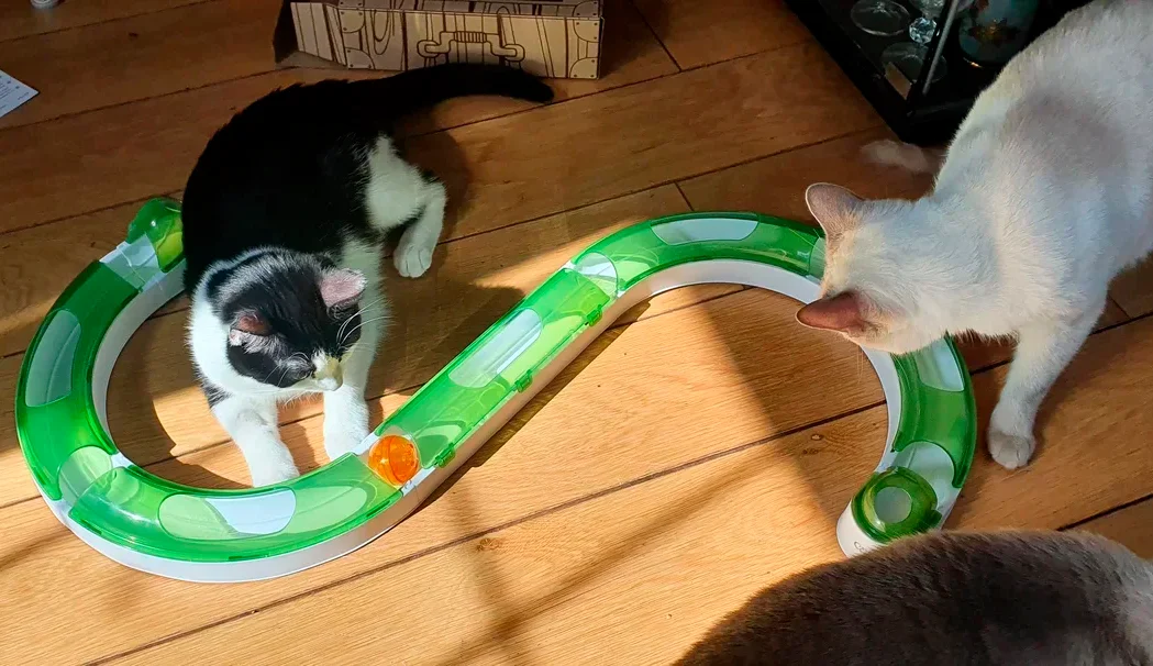 Я уже делала обзор малого кошачьего игрового трека - ссылка. И писала, что для Васи и Маруси моя читательница по имени Вероника прислали сертификат "Озон", чтобы я выбрала им игрушки. И я заказала большой трек, так как маленького им явно мало. 😺 Так как конструкции можно соединять, то мы малый соединили с большим треком. Кстати, очень качественный пластик у игрушки, даже моя вечно-всем-недовольная сестра Олеся обратила внимание, похвалив. Это был нонсенс. Получилась длинный такой трек-червячок. А так, вариации и форма сборки - на личное усмотрение. Ну и началось!!! Как говорится: "Играют все". 😁 Ну, в нашем случае - трое-четверо. Очень им понравился трек удлинённый. Забавно, что они в местах изгиба полежать любят все. 😁 Правда, иногда дорога мячику перекрывается... 🙀