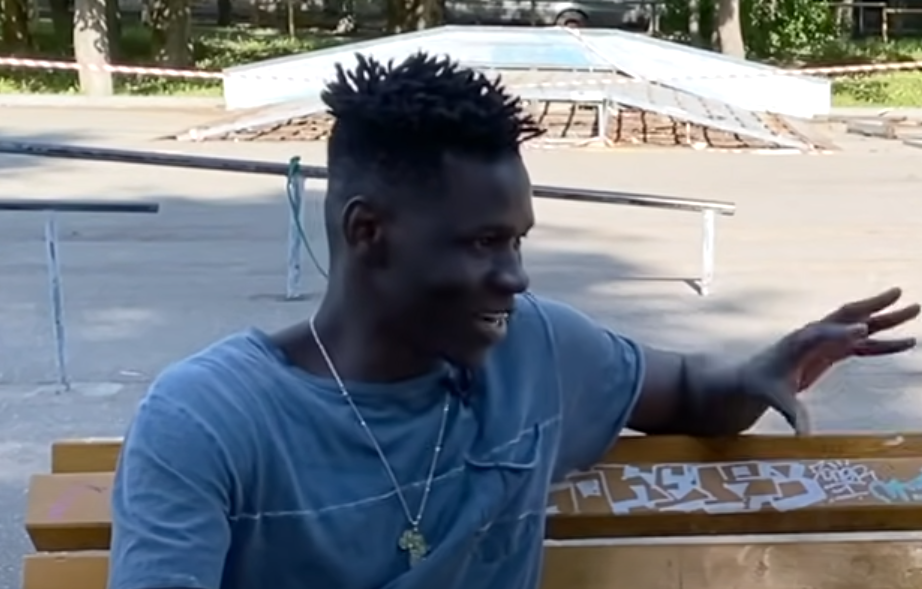 Черный справа рассказал, что его отец говорил про нашу страну только плохое, якобы в 90-ых было много гомофобов, но наш парень все равно приехал в Россию. Ему понравилось.