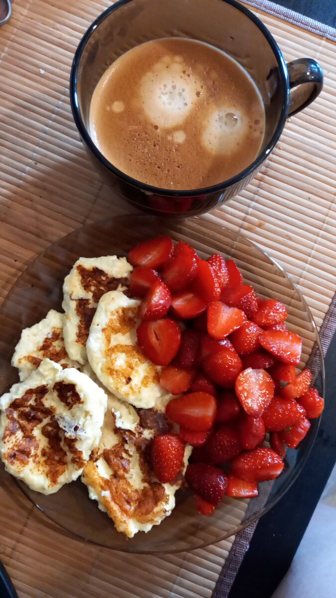 Завтрак. Кофе натуральный + Сахарозаменитель фитпарад +молоко 3.2%. Клубника и сырники. Обед Запеченое куриное бедро. Лодочка из баклажана с куриным филе. Огурец и помидор. Острый соус. Полдник Клубника,киви,нектарин. Ужин1 Тертый редис со сметаной и легкий супчик из курицы с морковью. Ужин2 Крылья,филе,огурцы и помидоры И итоговый отчет за день,где видно все граммовки и калорийность.
