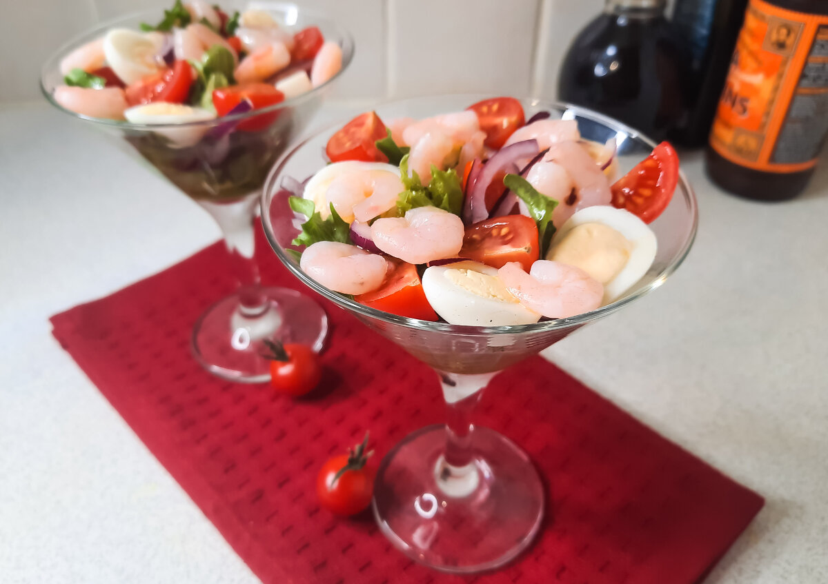 Черри и перепелиные яйца режем пополам, раскладываем по бокалам. Сверху кладём консервированные креветки. Можно взять вместо креветок мидии или использовать и то, и другое.