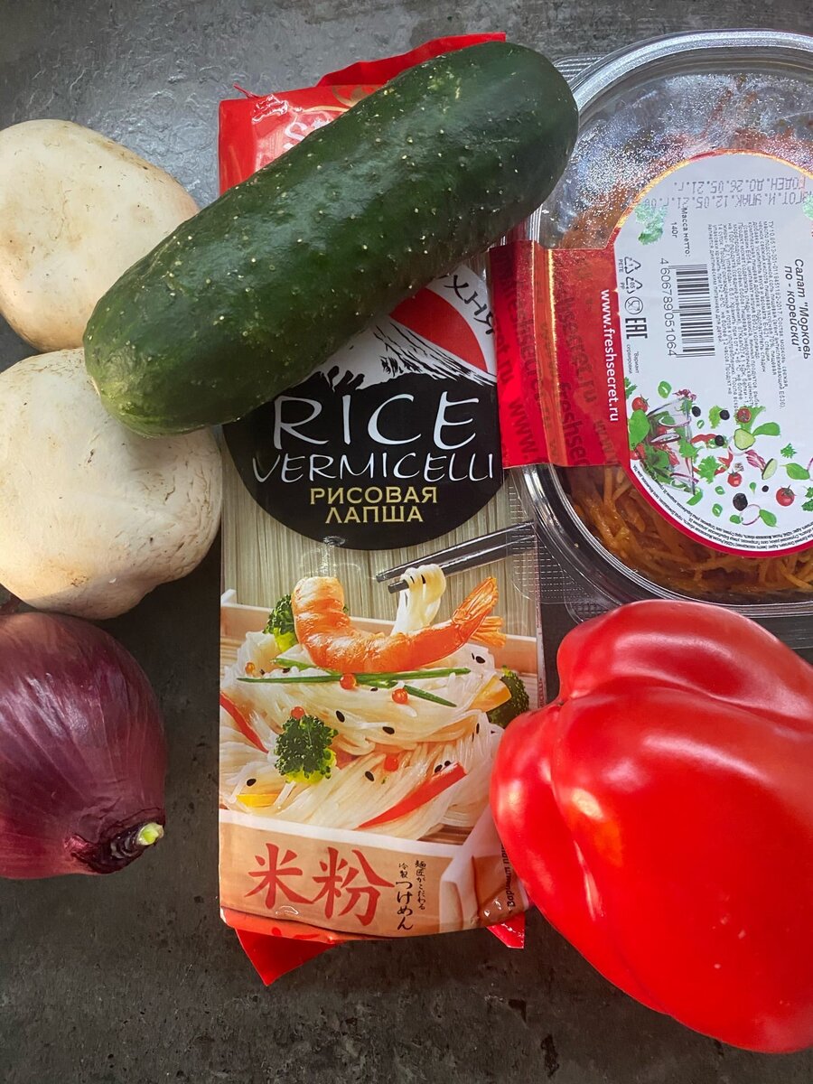 Всем привет. Сегодня мы будем с вами готовить салат с рисовой лапшой. Для салата нам понадобится: Берем луковицу, режем полукольцами, заливаем маринадом (для маринада нам понадобится: 2 ст. ложки уксуса, 1 ст. ложка воды, 1/2 ст. ложки черного перца) и даем постоять. Далее ставим воду, подсаливаем, ждем пока закипит. Затем, добавляем лапшу, варим до готовности. Откидываем на дуршлаг, промываем холодной водой и добавляем немного масла (я брала кунжутное). Огурец и перец режем соломкой и перекладываем в салатник. Грибы обжариваем, остужаем и добавляем к овощам: Добавляем к овощам лапшу и корейскую морковку: Затем, добавляем лук, вместе с маринадом: Все перемешиваем и наслаждаемся вкусняшкой) Приятного аппетита!