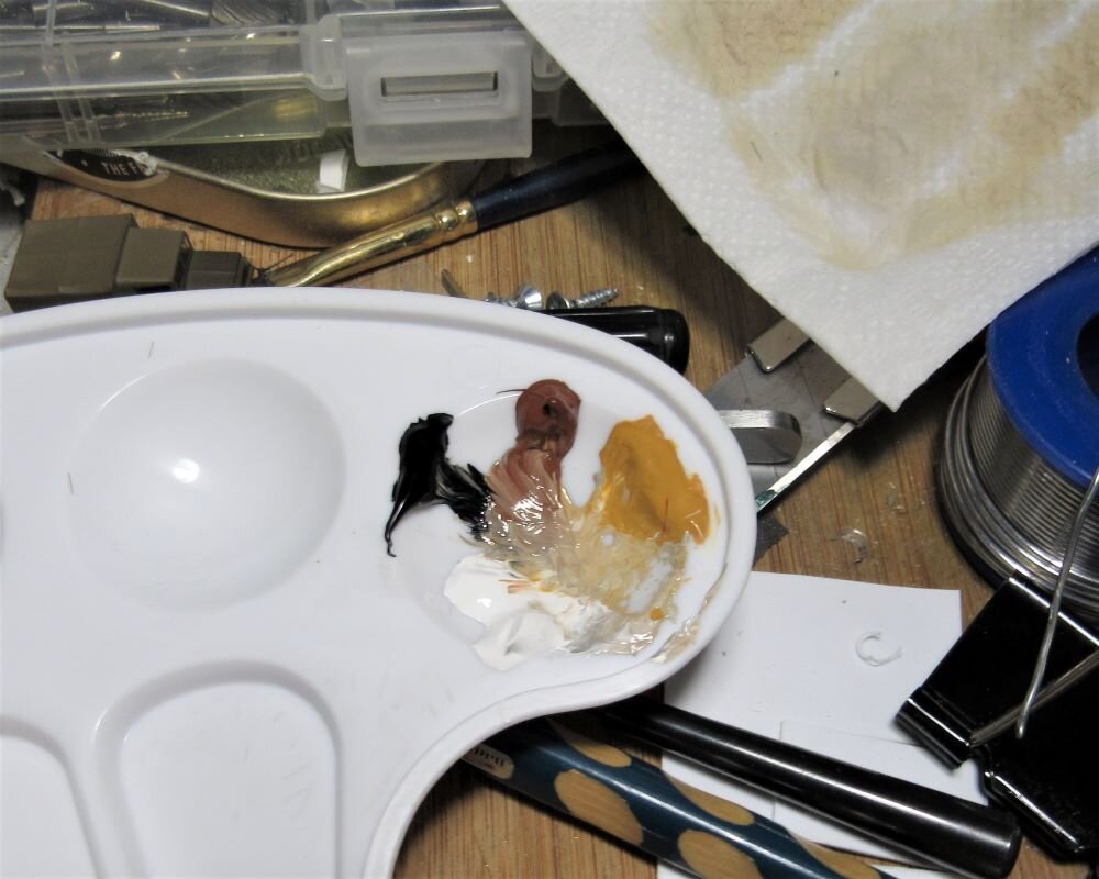 Итак, я начал делать грунт для грунтовой дороги и, заодно, обрывы. Перед этим я целый вечер просидел в обнимку с Яндексом и задавал ему глупые вопросы типа: "Опушка хвойного леса", "Обрыв в лесу", "Старый лес", "грунтовая дорога в лесу" , "Опушка леса в Германии" и т.д. Хорошо, что это просто электроника и она не умеет сердиться - она тысячами забрасывала меня фотографиями лесов, полей, полянок, заброшенных дорог. Из этого я отобрал чуть больше 50, которые стали для меня ориентировками. Я смешал четыре самых ходовых, для меня, акриловых краски и с усердием размалевал дорогу и склоны Получилось слишком плоско. Дороги и склоны оказались слишком неестественно плоскими. Не подумав (не делайте так! ), я использовал акриловый белый контур (по стеклу). Если я понимаю правильно, он представляет собой смесь ПВА и акрила и еще чего-то, поэтому он почти не теряет объем при высыхании. И пока он не засох я стеком и старым колесиком от машинки сделал неровности на склонах и следы от машины на дороге