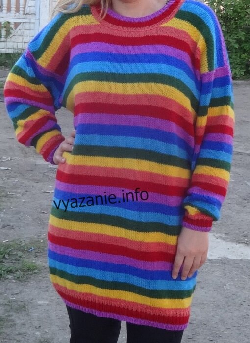 Свитер Радуга сейчас очень актуальный. Этот связан для школьницы. Вся его прелесть в ярких цветах радуги и размере оверсайз.