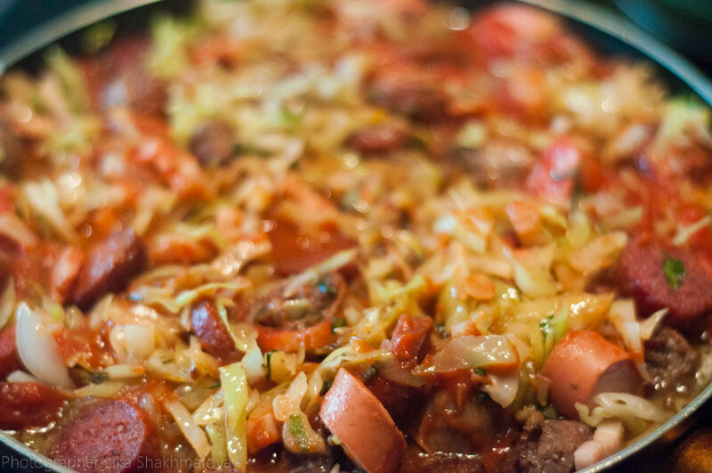 - 6. Снова уменьшите огонь, если готовите на газу, поставьте сотейник на рассекатель. На капусту выложите все мясные продукты, включая молочные сосиски. Закройте крышкой, готовьте, иногда проверяя, не подгорает ли низ, 20-25 мин. Подавайте солянку горячей.