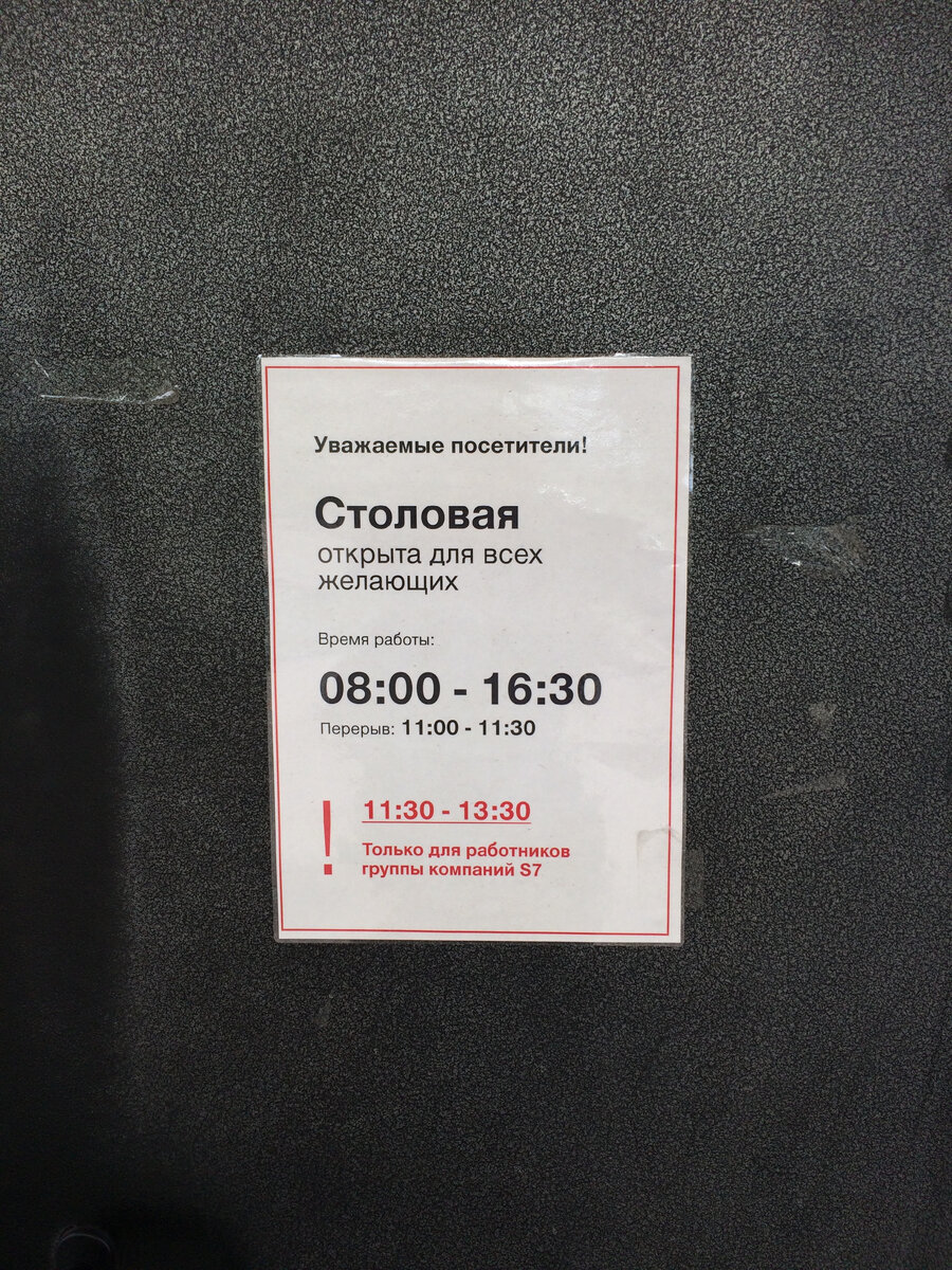Если вы предпочитаете самолет другим видам транспорта, то в курсе, как дорого стоит любое питание в московском аэропорту. Пошагово расскажу вам, как вкусно пообедать в Домодедово, не разорив семейный бюджет. Это табличка "тайной" столовой, которую станет ориентиром в гастрономический "бюджетный" рай. Только обратите внимание, что есть ограничения по времени приема пассажиров и работает столовая только в будние дни. Готовы начать путь? Для этого придется покинуть аэропорт Домодедово, то есть вы должны располагать достаточным количеством времени и посадочным талоном, где указано время начало посадки, чтобы не опоздать на рейс. Выйдя из терминала держите путь в сторону "Аэроотеля". Точный адрес - аэропорт Домодедово, 6/1. Как только увидите эту табличку, значит вы у цели. Следующая фотография, как ориентир заветного входа в столовую. Уже проходя у окон увидите уютный зал столовой и счастливые лица пассажиров и сотрудников аэропорта, которые аппетитно кушают. Табличку на железной двери