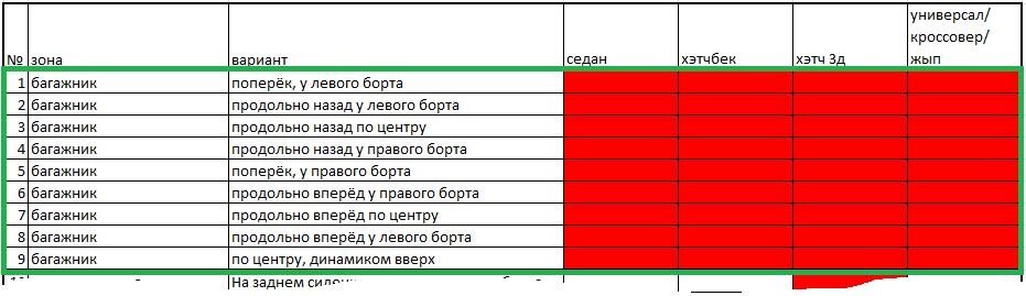 Как я обещал Володе В.Г., теперь рябление в глазах стопроцентное, ибо в каждом типе кузова планировалось измерение всех возможных вариантов размещения сабвуферов в багажнике. Единственная машина, с которой вышла частичная промашка — Chevlrolet Cruze, там пропустили вариант №9. Были ещё две машины, которые мы совсем пропустили. Одна — Vectra A с установленными в полку сабвуферами-free air (эксперимент был бы совершенно не показательным) и вторая — Isuzu Bighorn, у которой на полу бангажника богатая инсталляция из большого количества усилков и сабвуфера по центру: поставить тестовый ящик было просто некуда:(