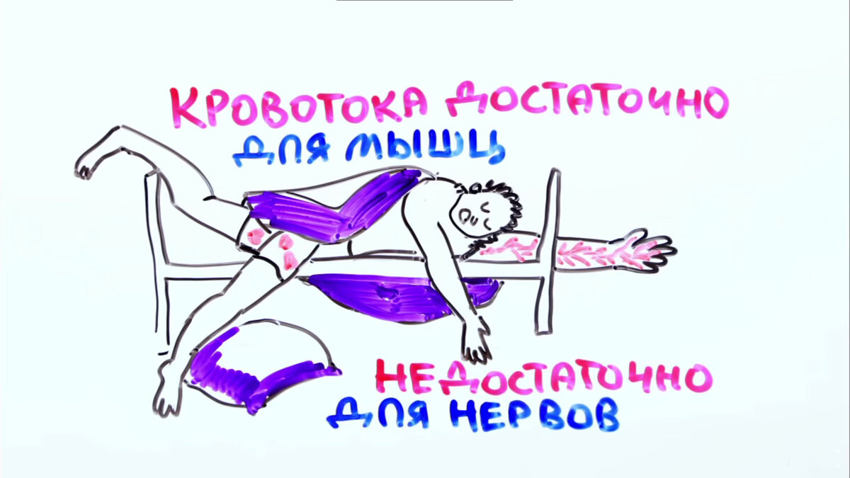 Обычно, мы сразу это чувствуем и меняем позу, чтобы восстановить кровоток, но если мы спим, нервы со временем тоже засыпают и конечность немеет.