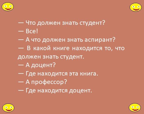 Идет экзамен в институте. Студенты пишут ответы в экзаменационных листах. Ходит профессор по рядам и вдруг, видит одного студента, который спокойненько обложился учебниками и справочниками, и бодренько так сдувает все ответы. Ничего не сказав, препод садится на своe место и с ухмылкой ждёт звонка. Звонок. Все кладут листы на преподский стол. Последним идeт и этот. — А у вас, милейший, я не приму. Вы списывали! Студент: — Да вы знаете, кто я? Препод, испугавшись: — Нет! Студент грозно: — Повторяю, знаете, кто я? Препод, еле слышно: — Н-нет, а кто!? Студент: — Вот и чудненько! Суeт свой лист в самую середину стопки и быстро убегает. Профессор обращается к студенту: