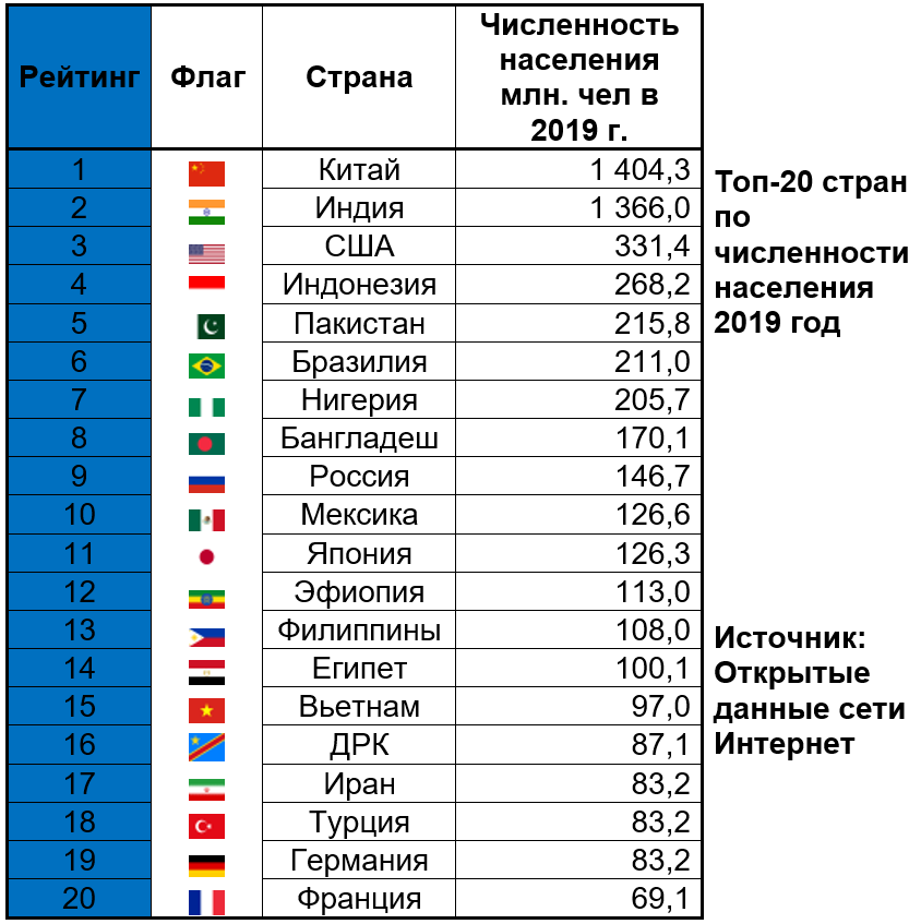 Топ 20 стран по населению.