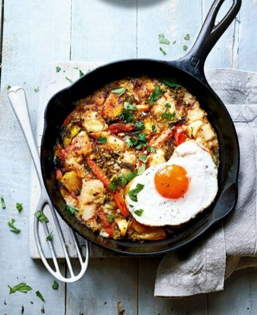 Ингредиенты 40 г несоленого сливочного масла 2 столовые ложки оливкового масла 1 лук-порей, нарезанный кружочками по 0,5 см 2 зубчика чеснока, измельченные и грубо нарезанные 2 свежие веточки тимьяна или большая щепотка сушеного тимьяна 250 г оставшихся смешанных жареных овощей, более крупные кусочки нарезать кубиками или ломтиками 100 г савойской капусты, крупно нашинкованной 1 столовая ложка цельнозерновой горчицы 250 г оставшегося картофельного пюре 4 больших яйца свободного выгула Растительное масло или сливочное масло для жарки Горсть листовой петрушки, грубо нарезанной, подавать к столу Рецепт Растопите 40 г сливочного масла с оливковым маслом в большой сковороде с антипригарным покрытием на среднем огне. Добавьте лук-порей, чеснок и тимьян, затем готовьте в течение 5-8 минут, пока лук-порей не начнет размягчаться и немного не приобретет цвет. Добавьте обжаренные овощи, капусту и горчицу, хорошо приправьте солью и черным перцем, затем готовьте еще 3-4 минуты, пока капуста не нач
