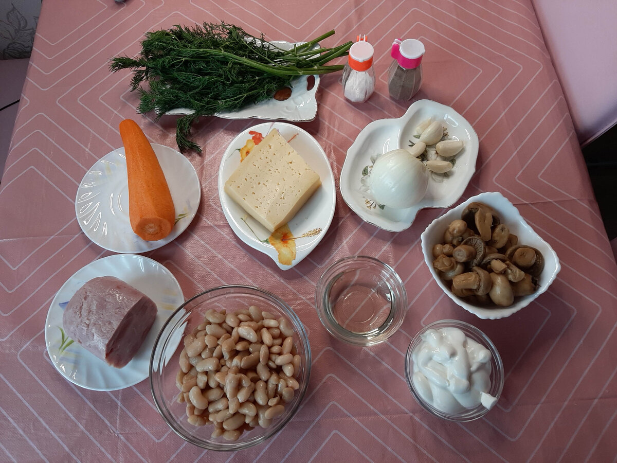 Это сытный и питательный салат и готовится очень быстро ⠀ Его можно сделать за 1️⃣5️⃣ минут, главное иметь все продукты в наличии 😉 ▶️ Салат с консервированной фасолью с грибами ⠀ 📍Ингредиенты: ⠀ 📎 1 банка консервированной белой фасоли 📎 150 гр. ветчины 📎 1 средняя морковь 📎 1 банка консервированных шампиньонов 📎 1 луковица 📎 4-5 зубчиков чеснока 📎 80 -100 гр. сыра 📎 пучок зелени 📎 2 ст.ложки масла растительного для жарки овощей + 1 ст.ложка для чеснока 📎 1 ст.ложка сметаны + 1 ст.ложка майонеза 📎 соль, перец по вкусу 📍 Приготовление: ⠀ Морковь потереть тонкой соломкой, спассировать на сковороде ⠀ Лук порезать полукольцами, спассировать ⠀ овощи сильно не зажаривать, слегка спассеровать ⠀ Грибы у меня были целые, я порезала их пластиками, тоже поджарить на сковороде грибы можно взять замороженные ⠀ Выложить в салатник все поджаренные овощи ⠀ С фасоли слить жидкость и промыть холодной водой ⠀ Ветчину порезать соломкой ⠀ Зелень измельчить Сыр потереть на терке тонкой