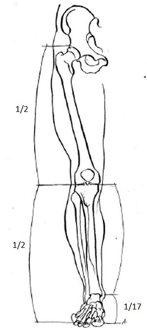 И снова пропорции ). На этот раз попробую разобрать размеры ноги и метод лепки стопы в частности. Длина ноги по эталону составляет 4 и 1/4 высоты головы фигуры , 1/4 из которых высота стопы (или 1/17 длины все ноги). Бедро = длине голени + высота стопы (деление происходит в колене). О длине стопы много всего написано ( стопа к длине кисти относится как 4:3 ; длина стопы равна длине предплечья от локтевого сгиба до шиловидного отростка; длина стопы – две высоты лица без лба; длина от подбородка до затылка; 4/7 длины бедра; 8/7 высоты головы и т.д.), поэтому думаю не будет ошибкой запомнить самое привычное и удобное: Длина стопы = 8/7 высоты головы. Ширина стопы в передней ее части от большого пальца до мизинца равна 1/2 ширины головы (ширина головы к высоте 1:1,618 примерно ¾ высоты головы) Либо 1/2 длины стопы без пальцев Ширина пятки в нижней части равна толщине руки в месте сочленения с кистью (примерно 1/5 длины стопы). Большой палец равен 1/5 длины стопы если измерять в профиль
