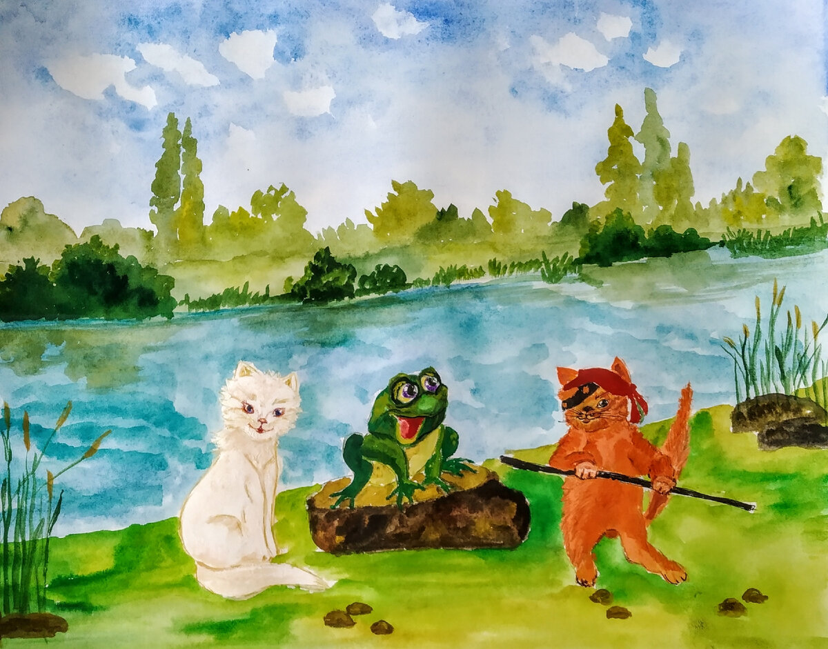 Они пошли обратно к дереву. Мурмурчик поднял свою красную дырявую тряпку, снова повязал ее себе на голову. Поднял палку с земли. Они с Пумпончиком переглянулись и смело ринулись в камыши, навстречу загадочному кресту. Котята прошли под ним, как под сводом и вышли на берег реки. У самого берега вода странным образом ходила кругами, как и говорила им Лягушка. Мурмурчик поднял камень и бросил его в воду. Ничего не случилось. Тогда он начал бить палкой по воде. И снова ничего не случилось. Пумпончик со смехом наблюдала за своим другом.