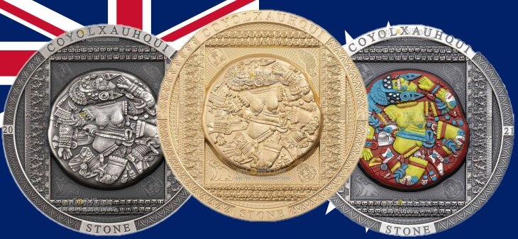 Эта монета выходит в серии «Археология и символизм». В нумизматических кругах возобновился интерес к поразительному искусству и археологии древней ацтекской цивилизации Мезоамерики. Империя ацтеков на самом деле не была такой долгой по великой схеме вещей, существовавшей примерно с 1345 по 1521 год, когда она охватывала европейский колониализм лицом к лицу с предсказуемыми результатами. Однако существует множество археологических и документальных свидетельств существования цивилизации, и регулярно находят новые артефакты. Старая столица ацтеков находится под Мехико, и в 1978 году был обнаружен каменный диск шириной 3,25 метра, на котором изображена история Койолхауки. Это делает его идеальным для серии Numiscolllect Archeology & Symbolism, в которой уже б