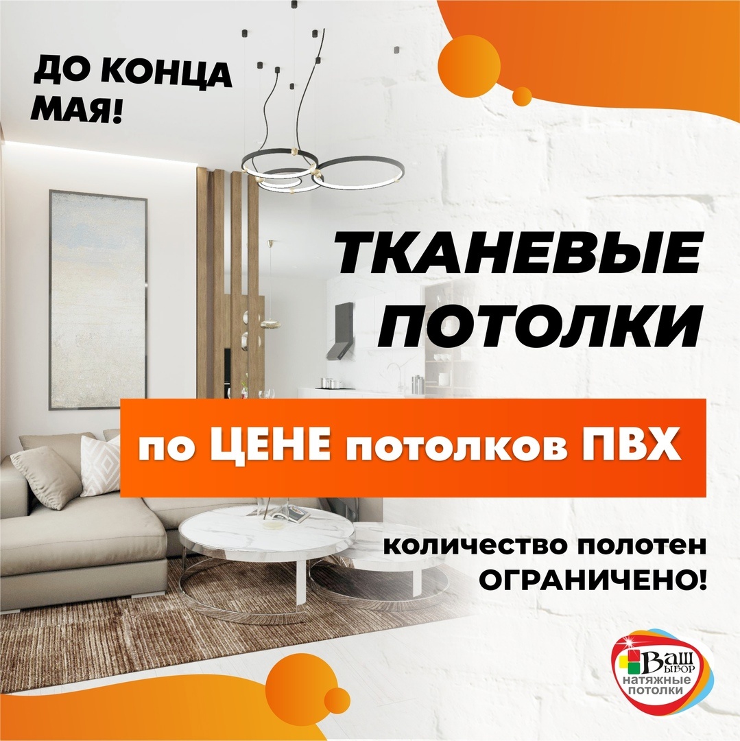 🔥 Весь МАЙ! ТКАНЕВЫЕ потолки ПО ЦЕНЕ потолков ПВХ! Тканевые потолки устанавливают без тепловых пушек. Подходят для установки в гостиные, спальни и детские. Они сочетаются со светильниками, световыми линиями и люстрами 👍🏻 Тканевые потолки отличаются ярко выраженной матовой поверхностью. Они выдерживают температуры от -40°С до +80°С. Это отличный вариант и для неотапливаемых помещений. ☝🏻Количество тканевых полотен по акции ОГРАНИЧЕНО. Только до 31.05! Хотите узнать стоимость тканевого потолка в свою площадь и зафиксировать себе акцию? Тогда нужно написать "Хочу ткань" нам в ЛС vk.me/natyazhnye_potolki_cheboksaru ✉
