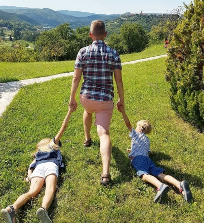 Глядя на это забавное фото, где идущий отец держит за руки своих детей, вспомните одну известную фразу состоящую из 4 слов.