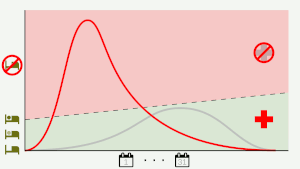 Сглаживание кривой заболеваемости за счёт замедления скорости распространения инфекции, позволяющее медицинским учреждениям справляться с возникающей нагрузкой[42][43]