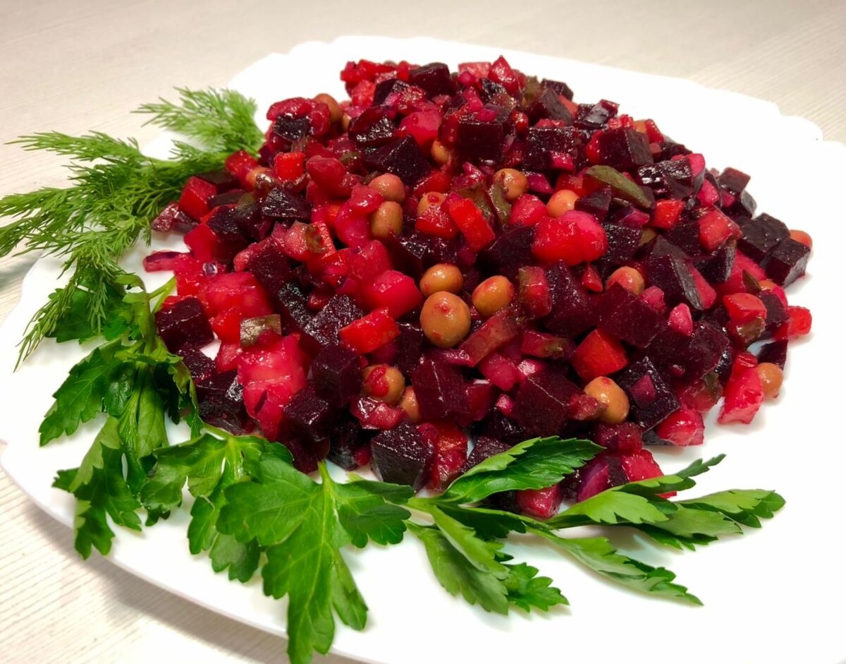 1. Винегрет овощной: Нам понадобится: Картофель — 30 г, морковь — 15 г, свекла — 20 г, огурцы соленые, лук зеленый или репчатый, капуста квашеная, зелёный горошек. Способ приготовления: Отварные картофель, морковь, свеклу нарезать тонкими ломтиками, так же нарезать огурцы. Лук нашинковать. Капусту перебрать и отжать, очень кислую — промыть. Овощи соединить и заправить маслом, уксусом, солью, перцем и горчицей. Можно также заправить майонезом с добавлением соуса «Южный» или салатной заправкой, добавлять соленые или маринованные грибы и филе сельди, нарезанное наискось тонкими кусочками. Летом кладут свежие помидоры, зеленый салат, а вместо квашеной капусты — маринованную. 2. Винегрет овощной с морской капустой: Нам понадобится: Капуста морская маринованная — 30 г, морковь — 30 г, свекла — 50 г, картофель — 40 г, огурцы соленые — 30 г, лук репчатый или зеленый — 20 г, масло растительное — 20 г, уксус 30 %-ный — 5 г, сахар — 3 г, перец чер