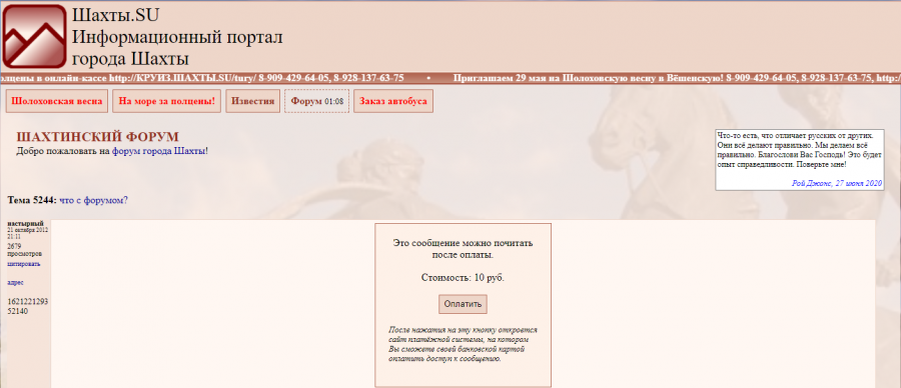 Я активно мониторю Яндекс в поиске хоть новой строчки контента. Удивительно что я всегда натыкаюсь на достаточно интересные а порой и абсурдные решения. Одно из таких решений это форум портала города Шахты, Shahty.su. Для начала просто мысль. Это городской портал. Это некоммерческий сайт. Представьте, что за каждую авторизацию на ГосУслугах вам нужно было бы платить по 10 рублей? Итак, к делу. Я наткнулся на форум, где что бы читать сообщения, за это нужно заплатить. Если вы думаете, что я просто нашел единичный скрытый пост на картинке ниже, и что такого больше нет нигде.... Бдамс... Вы ошиблись! Абсолютно каждое сообщение скрыто от тех, кто не заплатил. Такого на форумах я реально еще не встречал. Я знаю что существуют Хайды (Специальные спойлеры), они скрывают сообщение от людей у которых недостаточно дней регистрации, недостаточно баллов репутации или у них просто не та группа пользователей. Но обычно такие спойлеры используются на форумах, где активно обсуждаются схемы заработка в