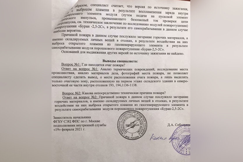 - Согласно заключению МЧС, причиной возгорания могла стать система пожаротушения, установленная на складе.
