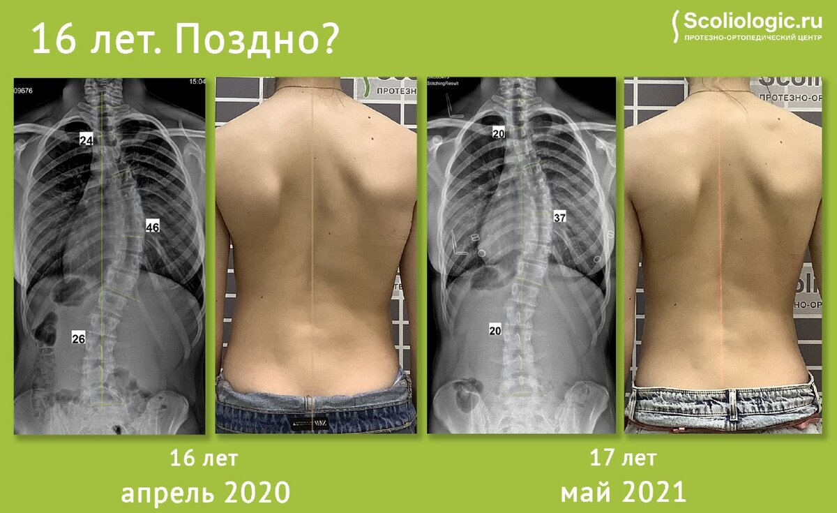 Иногда родители говорят: "Мы видели рентгены 16-17 лет, там ничего страшного, давайте попозже наденем корсет". А вот так нельзя. Если сколиоз 30-40 градусов обнаружили в 15-17 лет, скорее всего, и прогрессировать он стал позже, т.е. в 10-11 лет не было показаний для корсета. А если в 10-12 лет сколиоз 30 градусов, то к 15 может быть и 50, и 90. К сожалению, точно прогнозировать никто не может. Но, в любом случае, такой сколиоз уже значительно тяжелее исправить, если вообще он будет поддаваться лечению.