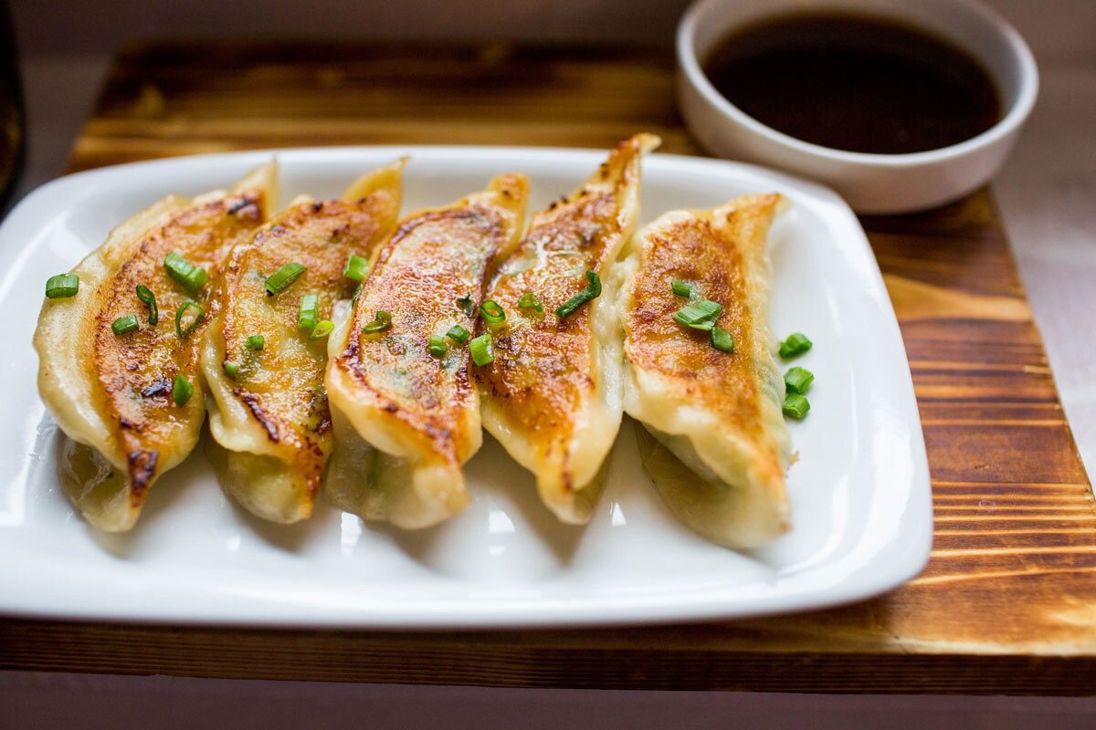 1. В миске смешайте 120 г свиного фарша, 120 г бланшированных мелко нарезанных листьев зелёной капусты, 40 г рубленого зеленого лука, 15 г чеснока, 10 г тертого свежего имбиря, 50 г соевого соуса, 30 г кунжутного масла, соль и молотый перец. 2. В середину заготовок из теста положите по кофейной ложке начинки. Смочите верхний край теста водой. 3. Сложите кружок теста пополам, выдавив воздух. Крепко соедините края пельменя по кругу. 4. Щипками плотно склейте боковые стороны, чтобы хорошо закрыть каждый пельмень. 5. Разогрейте на сковороде немного растительного масла, затем обжарьте гёдза в течение 3 минут с одной стороны. 6. Залейте сковороду до половины водой, накройте крышкой и продолжайте жарить на сильном огне до полного испарения воды. Снимите крышку и продолжайте жарить еще примерно минуту. 7. Ешьте гёдза горячими, обмакивая в смесь соевого соуса и рисового уксуса