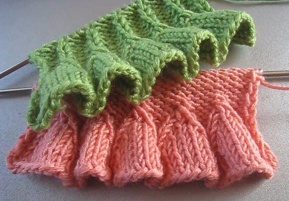 Красивые, пышные рюши, которые по форме напоминают бутоны колокольчиков. Вяжутся снизу вверх с переходом в любой узор. Такие складки оригинально дополняют любое изделие, делая его более выразительным. Как вязать рюши – видео: Для образцов использовалась пряжа в 100 гр. 260 метров; спицы 2,5 мм. Схема вязания поворотными рядами зеленого образца: Раппорт узора 12 петель (4+8), в конце вязания остается 4 петли; 12 рядов. Набирается кол-во петель, кратно 12 + 3 для симметрии + 2 кромочные. Подготовительный ряд: *3 лиц.; 9 изн.;* 3 лиц. Схема вязания по кругу здесь.