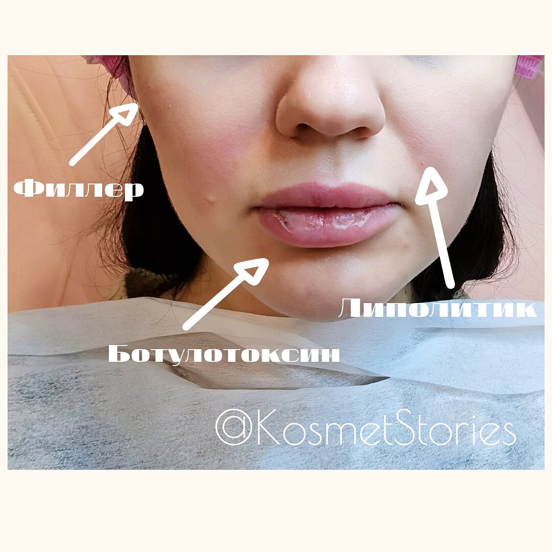 Комплексная работа или совмещение сразу нескольких препаратов. В данном случае как мы видим провисание средней трети лица в связи с похудением, запомните с данной проблемой можно столкнуться в любом возрасте! Я могла бы начать с носогубной части лица и методом инъекции ввести филлер (что изрядно испортило бы черты, черезмерным объёмом в нижней трети) , но если посмотреть на проблему под другим углом станет ясно, что лучше бы было начать со скул, что бы в свою очередь подтянуть наш кожный лоскут и разрешить провалы в области носогубных складок. В сами же носогубных складки я ввела непрямой липолитик, дабы облегчить груз жировой ткани, и так как данный препарат обладает лифтинг эффектом, он подтянет кожу данного участка, т. е. улучшит её, подтянет. А что касательно опущенных уголков губ, был введён ботулотоксин. И думаю на этом мы не остановимся, главное не торопиться. Ну а мы ждём эффекта от процедуры, который благодаря увеличения объёма в области скул, уже на лицо.