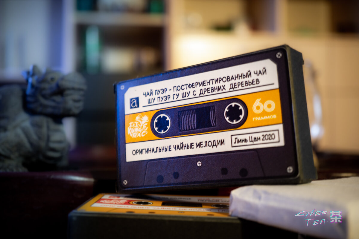 Особенности: сырье собрано с древних чайных деревьев. Внешне чайный кирпичик оформлен, как кассета с магнитной лентой, авторство упаковки и идея принадлежит Kungfu Tea, серия "Оригинальные чайные мелодии". Кирпич упакован в дышащую мягкую бумагу и внутри разделён порционно. Без упаковки, выглядит, как шоколадка. На удивление, он достаточно легко ломается руками, в отличие от некоторых других чаев этой серии. На внешний вид: лист очень красиво уложен, сбалансированный купаж, процентов на 20-30 состоит из рыжего почечного сырья. Аромат прессованного сухого чая тонкий и со сластинкой. В этот раз чай решили одновременно заваривать в гайвани и в глиняном чайничке, сравнивая между собой проливы. Чай в прогретой посуде почти не обладает ароматом, он очень слабый и сладковатый. Некоторые чайные товарищи и вовсе отмечали, что ничего не ощущают. Однако это не страшно, ведь чай прессованный и начне