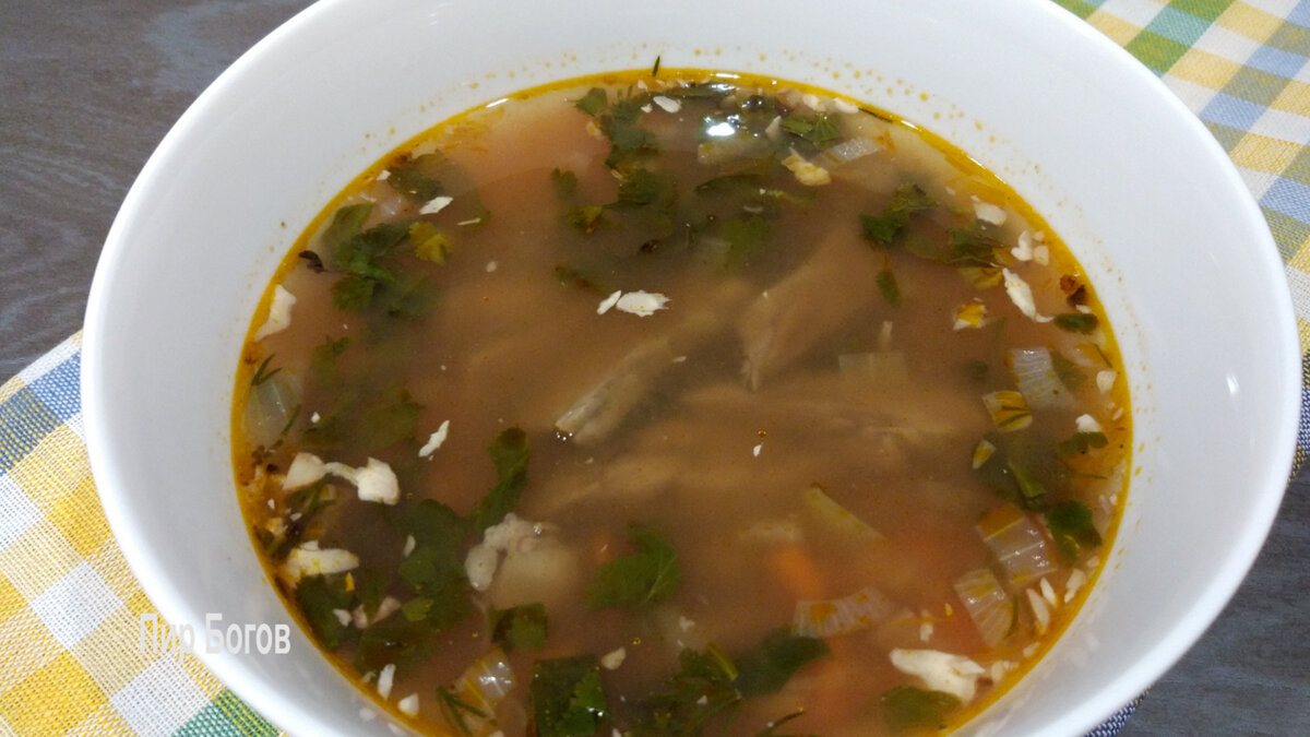 Классический суп «Харчо» готовится из говядины и без картофеля. Бульон получается наваристым и картофель там просто лишний. В супе почти не чувствуется кинза, чеснок и грецкие орехи. Меньше слов - больше дела. Идем готовить! Состав: 550гр говядины на кости (лучше ребрышки) 2,5 л воды 2,5 ст.л. риса 100гр (1шт) моркови 80гр (1шт) болгарского перца 6 зуб.чеснока 4 луковицы Кончик острого перца (по вкусу) 1 ст.л. ткемаливого соуса или 6 слив 1 пучок кинзы немного петрушки, укропа ½ ч.л. хмели-сунели, уцхо-сунели ½ ч.л. базилик ½ ч.л. соли 1 ст.л. грецких орехов 1/3 ч.л. красного и душистого перца 1 ст.л. томатной пасты Масло для жарки *** Подробный рецепт можно увидеть в видео на моем канале здесь или на канале YouTube Пир Богов вот здесь 🍲. Еще там есть много вкусных рецептов. 🥗🥧Подписывайтесь))) 😉 *** Способ приготовления: Мясо на кости помыть, обсушить бумажным полотенце. Нарезать крупными кусочками. Половину моркови, одну луковицу и болгарский перец крупно нарезать. Мясо слегка
