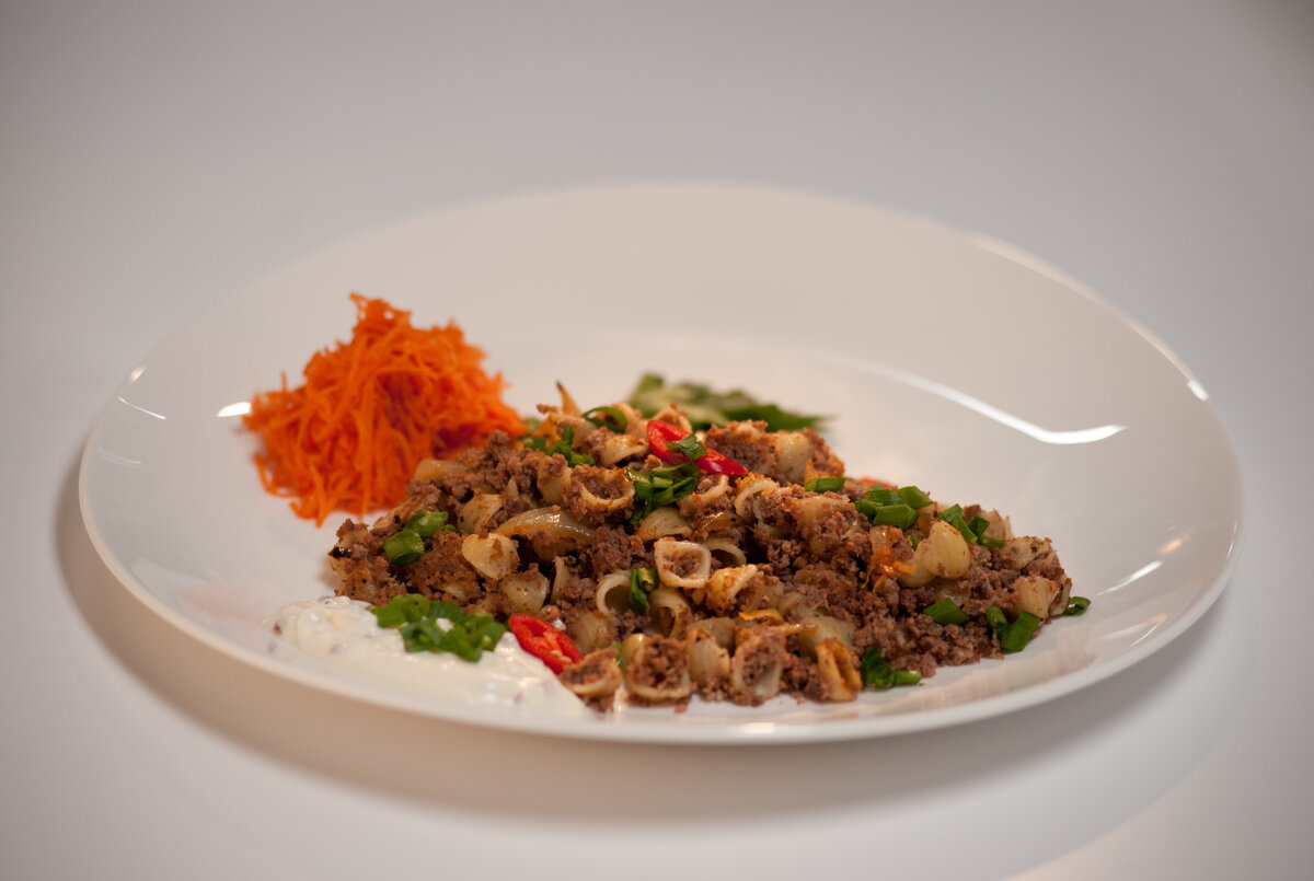 перец розовый горошек Способ приготовления 1. Нарезаем свинину и говядину. Обжариваем на сковороде до полуготовности. Посолим, поперчим. Пропускаем мясо через мясорубку. Выкладываем на сковороду и добавляем сухой базилик. 2. Обжариваем нарезанный репчатый лук на сковороде с добавлением сливочного масла. Добавляем две столовые ложки белого вина и столовую ложку томатной пасты. Посыпаем базиликом. 3. Натираем морковь на мелкой терке. Отвариваем макароны в подсоленной воде с добавлением растительного масла. Смешиваем сметану и розовый перец. 4. Смешиваем фарш с жареным луком. Добавляем ракушки и перемешиваем. Выкладываем ракушки по-флотски на тарелку. Добавляем морковь и сметанный соус. Посыпаем измельченным луком. Украшаем петрушкой и перцем чили. Приятного аппетита! Еще больше рецептов на сайте tveda.ru Любите читать Дзен Телеканала «Еда»? Расскажите свое мнение о материале в комментариях и ставьте лайки!