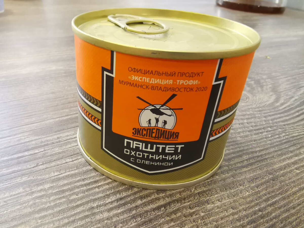 Бродил я среди витрин и полок по "Ашану" и внезапно наткнулся на знакомый логотип среди консервных банок. Оказалось, что это паштет от именитого бренда "Экспедиция". Эта компания популярна среди любителей охоты и довольна известна в России. В моем городе даже ресторан есть от этого бренда "Экспедиция", где подают всякую дичь. В буквальном смысле. То есть там представлены деликатесные блюда из пойманных диких животных. А теперь предстало время прикоснуться к этой роскоши и попробовать паштет из оленины. Лично для меня это диковинка, и я решил прикупить себе баночку. Но если быть совсем честным, то я "повелся" на бренд. Мне стало безумно любопытно, что же такое там скрывается под банкой. Цена была около 88 рублей. Плюс минус пару рублей. Официальное название "Паштет охотничий с олениной". Это официальный продукт "Экспедиция-Трофи". Да и вы сами ниже все можете прекрасно увидеть. А что же с составом? Если быть до конца честным, то прочитал я его только после того, как попробовал. И заста