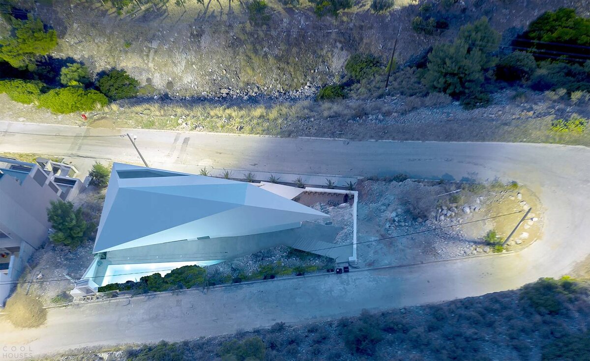 Необычный дом с крышей в форме гигантского бриллианта находится в Греции, в южном пригороде Афин, поселке Вуле. Особняк был спроектирован студией дизайна «314 architecture» и построен в 2019 году. Нестандартный угловой участок площадью 500 кв. м. имеет треугольную форму с одним очень острым углом, который формируется резким поворотом горной дороги. Дом словно вырастает из горы под названием Имиттос, и практически висит на ее склоне. Такая сложная геометрия участка повлияла на выбор конфигурации дома. Его площадь составляет 300 кв. м., в нем 4-ре уровня, разных по размеру и форме. В некоторых частях несущей конструкции дома скалу пришлось равнять, чтобы обустроить на этом месте террасу, в других рельеф естественно вписан в здание. Цокольный этаж практически полностью поглощен скалой, в нем находится гараж и вспомогательные технические помещения. Разрабатывая архитектуру дома, дизайнеры вдохновлялись традиционным японским искусством оригами. Кажется, что все углы и преломляющиеся грани з