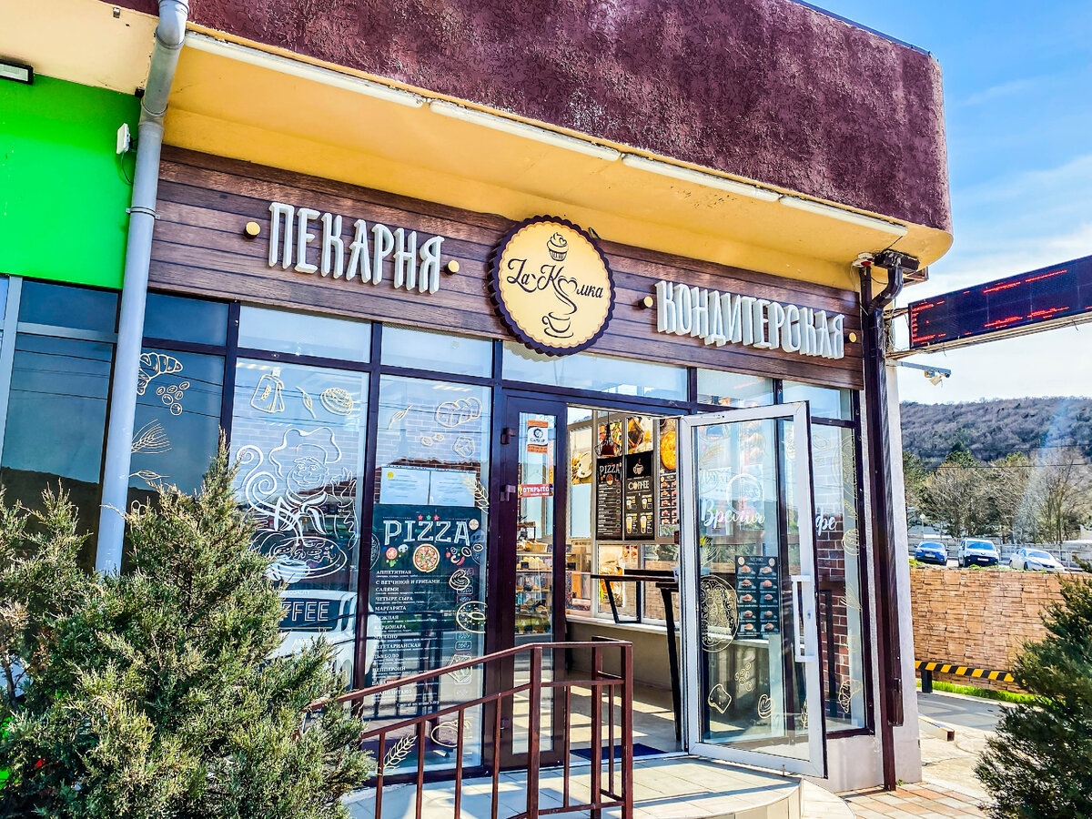 Гуляя по курортному селу Сукко, что находится недалеко от Анапы, на пересечении двух улиц мы увидели кондитерскую -пекарню под названием "La'комка". Решили туда зайти и посмотреть, что интересного там продают. А если нам что-нибудь понравится, и цены будут не очень кусачими, то почему бы не купить на вечер в номер? Начнем наш обзор мы с выпечки. Кукурузный хлеб в этой кондитерской-пекарне можно было купить за 40 рублей. А за 39 рублей продавался лаваш. Был также большой выбор печений. Например, печенье домашнее продавали по 30 рублей за 100 грамм, печенье апельсиновое - по 18 рублей за 100 грамм, а злаковое - 26 рублей за 100 грамм. Кукурузное печенье продавали по 38 рублей за 100 грамм. А сладкие рулетики с джемом, посыпанные сахарной пудрой - по 30 рублей за 100 грамм. Были в продаже и пирожки. Слойки с курицей и с ветчиной, например, продавали по 66 рублей за штуку. А за 63 рубля можно было купить растегай с курицей. Всем известная самса с мясом продавалась по 66 рублей. А простые