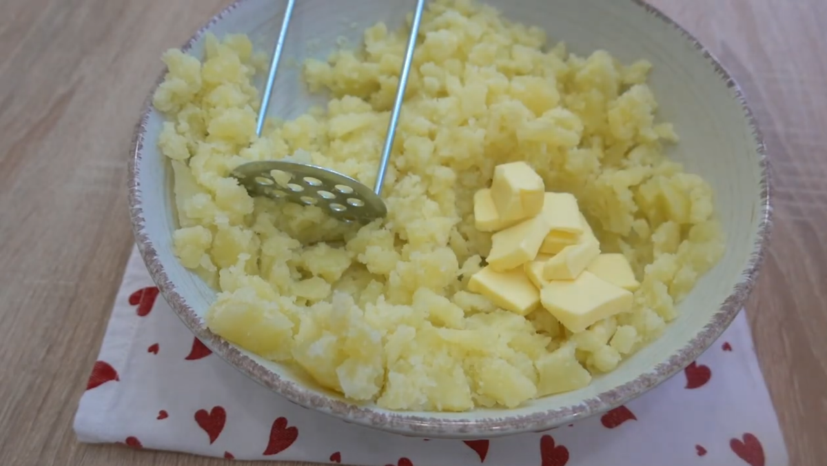 1. Картошку отвариваем, сливаем с неё полностью всю воду и превращаем в пюре.