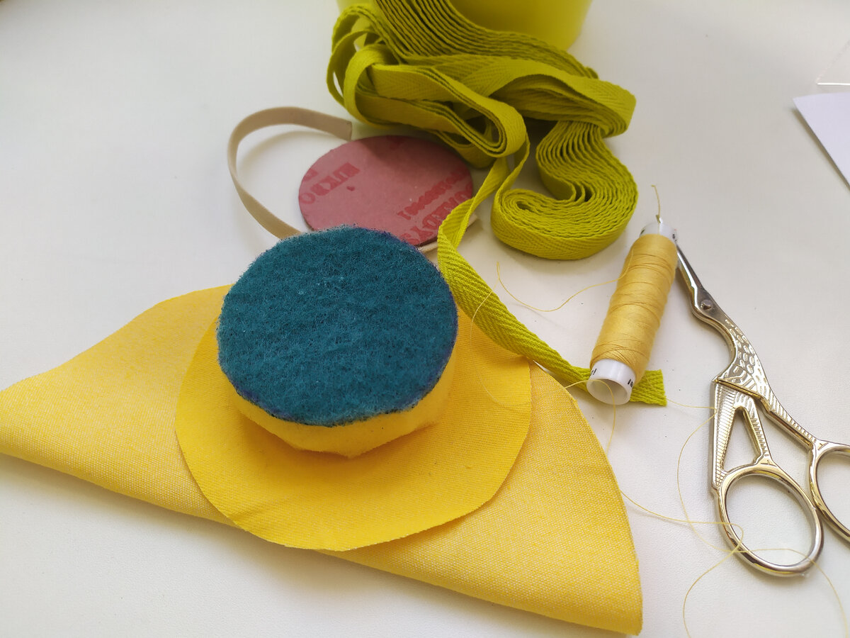 У швеи должно быть всё прекрасно и душа, и руки, и даже красивая игольница. Нам понадобится: У меня было несколько игольниц, как на фото выше, но за годы шитья все они подистаскались и пенопласт раскрошился и не держит. Я распорола их и вытряхнула всё. Оставила только картонку Из ткани вырезаем первый круг. Он шире картонки на 1.5-2см по всей длине. Берем иголку и нитку и прошиваем по кругу. Швом вперёд иголка и отступаем от края примерно 5мм. В центр помещаем картонку. Можно ее клеем-карандашом приклеить даже. Стягиваем нитку хорошенько и завязываем узелок. Второй круг нам нужен уже в 2 раза большим диаметром чем основа. Также по краю делаем строчку для сборки. Из губки вырезаем круг тем же диаметром что и основа. Можно чуть больше. Часть жесткой стороны срезаем. Примерно 5мм Вкладываем внутрь круга губку. Жетская сторона в центре внизу. За нее хорошо держатся иглы. Стягиваем нитку. Стараемся сильно не сплющить губку. Отрезаем резинку. Вам должно быть комфортно, а все резинки тянут