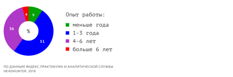 Многие работодатели даже вынуждены переплачивать сотрудникам, чтобы не упустить их. Это приводит к постоянному росту зарплат в ИТ-индустрии и снижению требований к опыту специалистов. На 60% вакансий приглашаются кандидаты с небольшим опытом работы (1-3 года - 51% или даже меньше года - 9%)