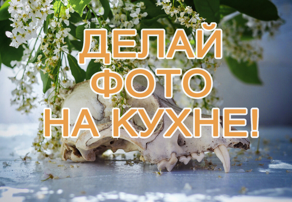 Зашёл я на кухню сделать чай, гляжу, а тут такой крутой свет, как ты уже понял, я не смог устоять.. Притащил на стол белый фон (его я недавно сколотил), многострадальный череп и увядающие ветки черёмухи (они нужны были для другой фотографии, но так и остались пахнуть дома). Я решил не использовать дополнительные источники света, ведь его, света, и так много из окна, только отражатель, роль которого, как всегда, исполняет кусок пенопласта. Быстро выстроил сцену, здесь всё просто.. Конечно можно использовать красивые букеты и всякие другие радости, это дело вкуса и задумки, сегодня так. Свет из окна жёсткий да и стрёмные стены на фоне.. это всё и одним махом я исправил натянув на фоне белую (белый?) тюль) Сверху сцена выглядит так Почти всё готово, делаю пристрелочный кадр Снимал на Nikon D7000+Nikkor 50mm 1.8D. IS0 100, диафрагма по вкусу (у меня была 2.2-2.8) и выдержка по ситуации, подбираем (солнце за тучки зашло или что ещё, значение сразу изменится). Понятно, что нужен отражатель,