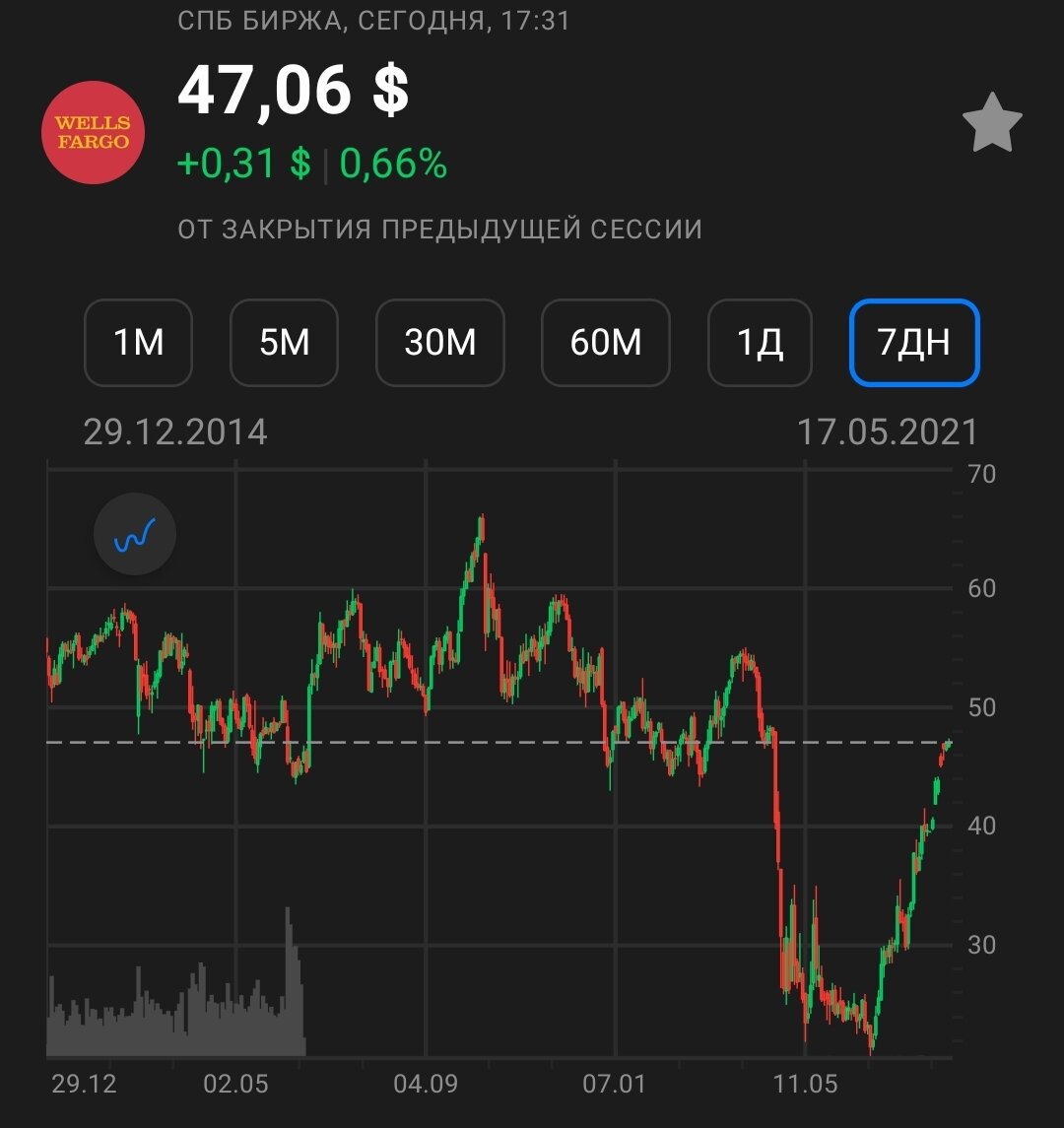Чуть больше года назад я начала активно спекулировать акциями компаний через российского брокера. Тогда я думала, что занимаюсь инвестированием, но при этом у меня были чёткие планы по продаже активов после их удорожания. Сейчас я понимаю, что занималась трейдингом, просто не внутри дня, а внутри месяца приблизительно. В июне 2020 года я совершила крупную покупку. Приобрела на 25% от капитала сильно просевшие акции компании Wells Fargo. Это американский банк, входит в четвёрку крупнейших банков США. Причём я покупала не лесенкой, а сразу бухнула в эти акции четверть всей суммы. Практически сразу котировки пошли вниз. Было еще много возможностей для более удачного входа в эту бумагу, но усредняться было уже нечем. Так я просидела в просадке около 7 месяцев. Внезапно цена начала расти, я вышла в плюс по бумаге. Психология работала против меня и мне захотелось продать надоевшие бумаги сразу после выхода котировки из красной зоны. Я не продала, когда было +5%, потом не продала когда был