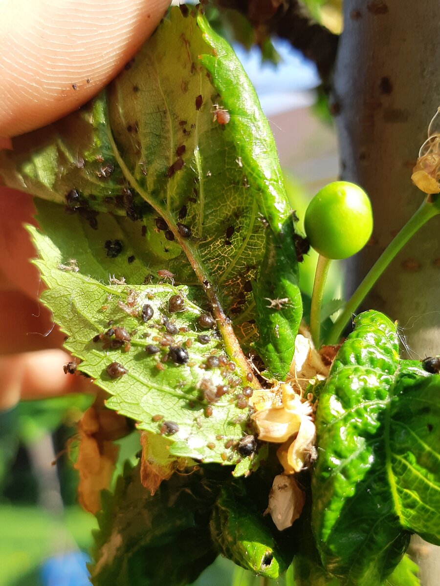 Здравствуйте! В прошлом году у меня было столько тли, особенно на черешне, что все молодые листья скрутились, и дерево совсем не давало прироста кроны. Кстати, не смотря на это, ягод черешни было тоже очень много. Поэтому я особенно сильно обеспокоился, что дерево из-за тли не развивается. Ведь хотелось надеяться, что в следующем году урожай будет еще обильней. Интересный способ защиты от тли подсказал сосед. Он рассказал, как сделал какие-то пояса с клеем на стволы своих плодовых деревьев. В общем, я все разузнал, рассказываю. Сперва ту тлю, которая уже сидит на ветках необходимо вывести специальными препаратами. Делать это нужно либо до цветения, либо после, чтобы не навредить опыляющим насекомым. Ампулы с препаратом от тли продаются во всех садово-огородных магазинах. К сожалению, у меня нет мощного садового распылителя, по этому я там же, в магазине беру простой курковый распылитель, который накручивается на двухлитровую бутылку. С курковым распылителем мне немного трудно, но хоть