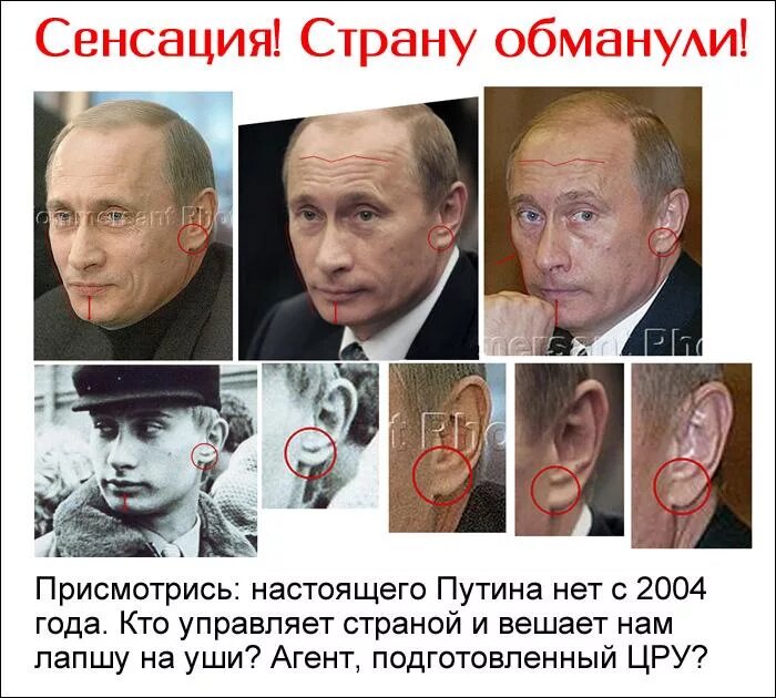 Частенько, особенно в соцсетях мелькают «новости» о подлинности сегодняшнего Президента РФ. И вызывают ведь немалый ажиотаж. Есть даже убеждённые сторонники этого факта, обоснованно, и с фотографиями доказывающие сей «прискорбный» для России «факт» — настоящего Путина олигархи убили в 2007 году и заменили на послушного двойника или двойников! Есть ещё аналогичная версия про 2011 год: На самом деле, всё это чисто эмпирическое восприятие народом происходящего, связанное в первую очередь не с личностью Путина, как таковой, а с жизнью вокруг сегодня и тем, что уже прошло. На это указывает и дата «подмены». Первые семь лет Путина — это действительно внешне серьёзные изменения в стране, особенно на фоне «эпохи» алкаша Ельцина. Рост уровня жизни населения, «усмирение» Чечни, подъем национального духа. Вот только мало кто понимает, что к личности самого Путина все эти плюсы имеют очень далёкое отношение. Если имеют вообще. Всё дело в цене нефти и газа. При Ельцине нефть стоила 15$, а при Путин