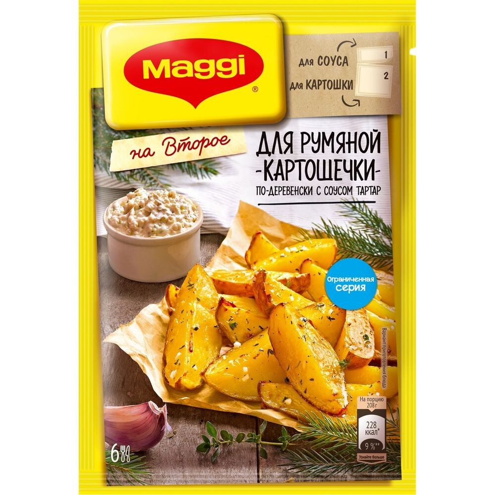 Сегодня мне захотелось жаренной картошки и я вспомнил про разные приправы от магги и отправился за ними в магазин. Там я увидел вот такой пакетик и сразу же его взял. Придя домой я взял молодую картошку, порезал ее кружками и обжарил с данной приправой. И хоть в рецепте говорилось запечь ее в духовке, результат который получился на сковородке вышел весьма вкусным, у картошки появился явный вкус. Но также в этом пакетике шла приправа для соуса тар-тар и ее я также попробовал. В общем соус также получился вкусным, но на мой взгляд приправа была слишком соленая, что даже довольно кислый соленый огурец который я добавил не смог это скрыть. По итогу хочу сказать что если вам также надоел вкус обычной жаренной картошки, то данная приправа сможет это исправить.