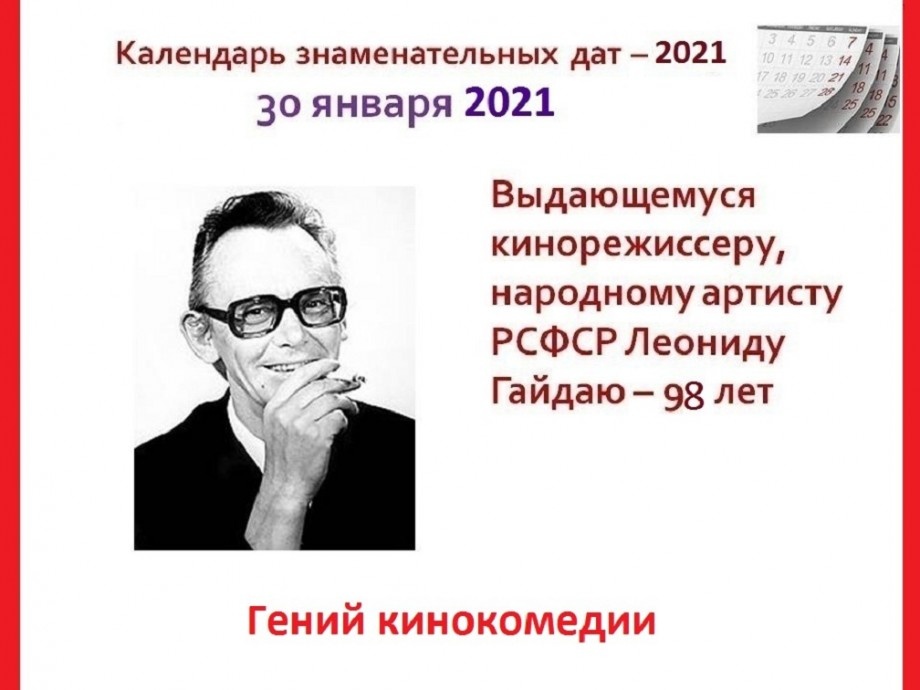 Мне стало интересно узнать о режиссёре моих любимых фильмов, которые я со своей семьёй пересматриваю каждый год. И оказывается, что я ещё узнал и много чего о фильмах. 1.Леонид Иович Гайдай — великий и смешной отечественный режиссер, гений кинокомедии. 2.Вершиной творчества Леонида Гайдая — великого комедианта, были 60 — 70 годы прошлого века, когда советское кино было на высоком уровне. 3.Фильмы тех лет являлись примером национальной гордости за наш кинематограф. 4.Это был кропотливый и поистине филигранный труд, который выносился на суд зрителей. Народную любовь надо было заслужить. Леониду Гайдаю это удалось. 5. Советские люди засматривались его фильмами и разбирали на цитаты диалоги героев. 6.Проходят года и десятилетия, уже давно нет Советского Союза, сменяются поколения, а фильмы Гайдая актуальны и любимы по сей день. 7.Именно юмор Гайдая, не подвластный времени, и лёгкость восприятия его картин, не оставляют равнодушными ни одного зрителя его кинокомедий. 8.В творческой копилке