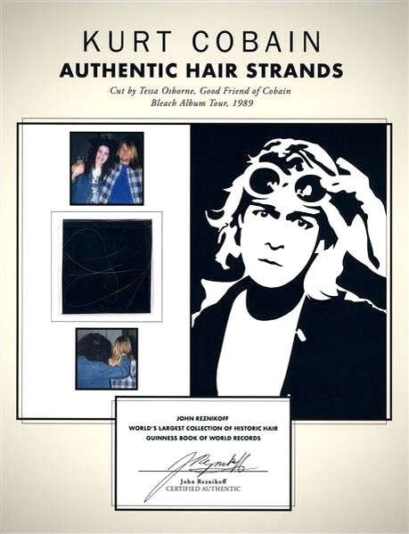 На днях аукцион iconic выставила лот - прядь волос Курта Кобейна. Стартовая цена такого лота - 2500$, также к ним прилагается фотография, на которой эти волосы состригают. Волосы были сострижены в 1989 году во время гастролей в поддержку первого альбома группы Nirvana.