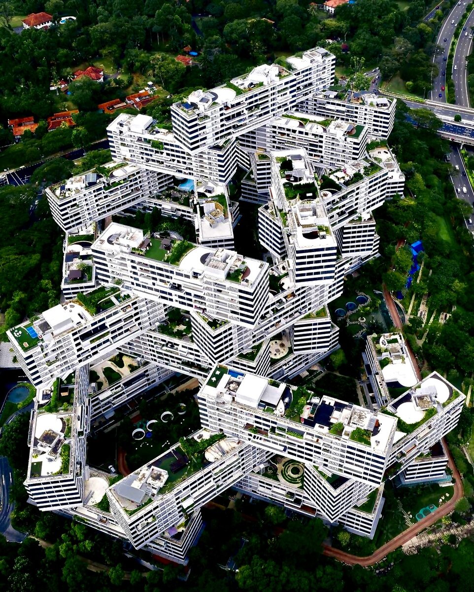 Жилой комплекс в Сингапуре, построенный в 2013 году. Как сложенный из кирпичей: состоит из 31 жилого блока по 6-этажей, а всего в комплексе 1040 квартир. Авторы Интерлейса - голландский архитектор Рем Колхас, его проектное бюро Office for Metropolitan Architecture (OMA) и немецкий дизайнер Оле Ширен.