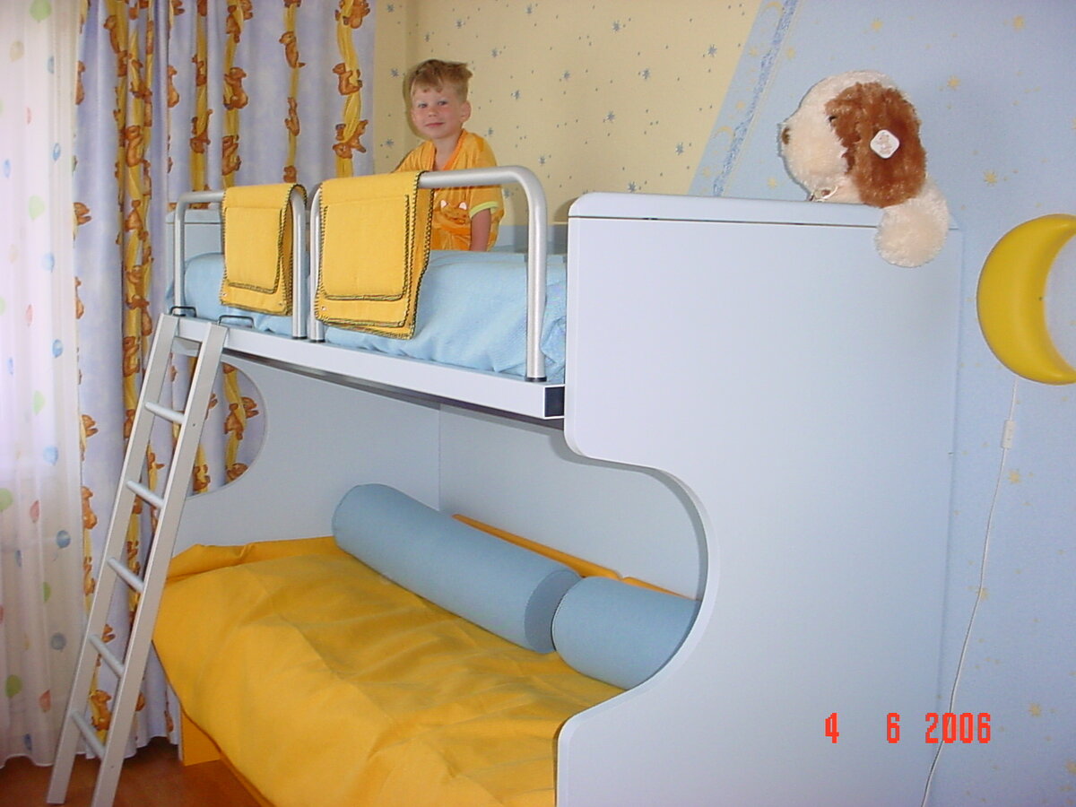 2 года назад мы делали дома ремонт. Девочки переехали в отдельную детскую комнату на двоих. У каждой спросили, как она видит свою комнату. Старшая попросила большой стол и удобную кровать, а младшая, которой в тот момент было 6,5 лет, сказала, что мечтает о двухэтажной кроватке-домике. Чтобы можно было спать, и было место расселить коллекцию мягких зверюшек. Девочки пришли к компромиссу, что комната будет в сиреневых тонах и я стала искать в продаже подходящую двухэтажную кроватку-домик. Цены на них кусались. Приличные варианты начинались от 50 тыс. рублей. Мы понимали, что ребенок скоро наиграется и надоевшую кровать нужно будет куда-то девать. Откровенно жалко было покупать такую дорогую кровать на пару лет. Но тут хорошую идею подкинул старший сын. Он предложил взять его старую двухэтажную кровать и сделать из нее домик. Вот кроватка сына, когда она была новая: Она совершенно не подходила по цвету в новую комнату девочек, и мы решили сшить на нее чехол. Красивую ткань удалось купит