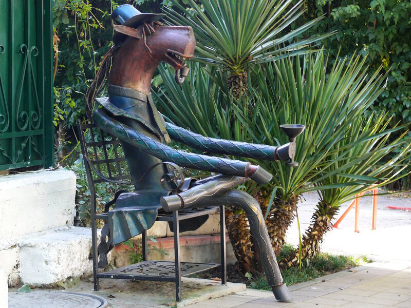 Многие сочинские скульптуры являются творением местного художника Акопа Халафяна. В его его коллекции уже более 50 работ, выполненных их холодного металла. Она из самых популярных - скульптура "Конь в пальто", расположенная на Театральной площади Сочи. Здесь частенько собираются очереди из желающих сделать селфи в обнимку с колоритным конем и бросить потом монетку в его кубок на счастье.