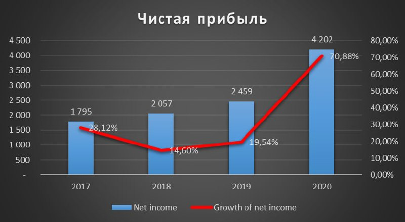 📌NWC ($ млн.) 201️⃣7️⃣: 9.782 201️⃣8️⃣: 7.059 201️⃣9️⃣: 11.576 202️⃣0️⃣: 12.548 Net working capital увеличивается уже 4-й год подряд. Обычно это присуще развивающимся компаниям, которым, однако, требуется много кэша для покрытия своей деятельности. 📌Current ratio 201️⃣7️⃣: 1,43 201️⃣8️⃣: 1,27 201️⃣9️⃣: 1,43 202️⃣0️⃣: 1,33 📌Quick ratio 201️⃣7️⃣: 0,26 201️⃣8️⃣: 0,36 201️⃣9️⃣: 0,42 202️⃣0️⃣: 0,36 Показатели ликвидности показывали рост до ковида. Удивительно, что PayPal не стал ликвиднее за ковид. В любом случае, компания остаётся с большим запасом ликвидности. 📌Net debt/EBITDA 201️⃣7️⃣: (-0,33) 201️⃣8️⃣: (-1,86) 201️⃣9️⃣: (-0,66) 202️⃣0️⃣: 0,93 Отношение чистого долга к EBITDA долгое время оставался ниже нуля, что говорит о низком уровне долгов. За последний год показатель резко увеличился, однако PayPal сохранила статус финансово устойчивой компании. 📌Revenue ($ млн.) 201️⃣7️⃣: 13.094 201️⃣8️⃣: 15.451 201️⃣9️⃣: 17.772 202️⃣0️⃣: 21.454 📌Growth of revenue 201️⃣7️⃣: 20,77% 201️⃣8️⃣: 1