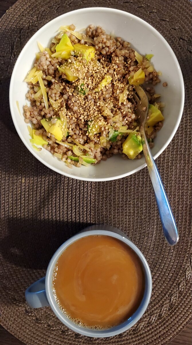 Всем привет! Сегодня покажу вам мой пример вкусного и полезного меню на день. На самом деле у меня очень большой опыт подсчёта калорий. Этот метод не раз помогал мне проанализировать свой рацион и понять слабые места. Но в долгосрочной перспективе это для меня не работает: утомительно и скучно. Я люблю относится к еде легко, с удовольствием и фантазией. Подсчёт калорий может заставить нервничать, отказываться от хорошей еды лишь потому что она более калорийная и составлять рацион, подгоняя его под калорийность, а не под мои желания. Мой секрет: полюбить здоровую еду, приготовить её вкусно и есть разнообразно и сытно, чтобы не хотелось скомпенсировать недостаток вкуса чем-то сладеньким или фастфудом. Завтрак Зеленая греча с авокадо, кукурузным маслом и сыром. Если вы до сих пор пренебрегаете зеленой гречей, настоятельно рекомендую дать ей шанс! Это совершенно иная греча. Она более упругая, рассыпчатая и имеет более нежный вкус. И да, она полезнее обычной, хотя и обычная тоже заслу